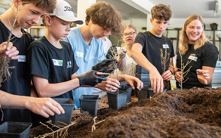 Eine Jugendliche arbeite an einem Hochbeet.